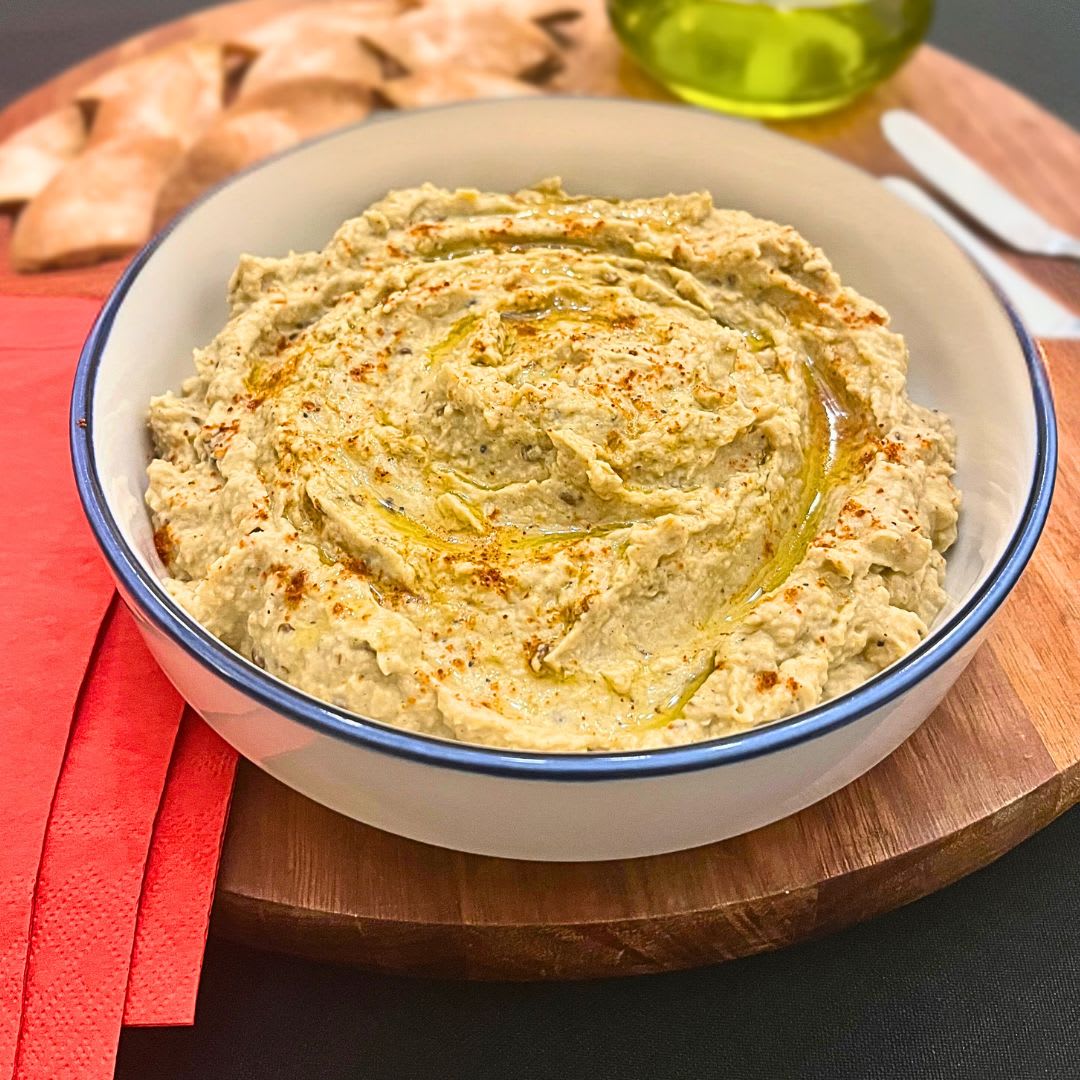 Fusão do homus com o babaganoush: berinjela defumada no fogão e grão-de-bico criam uma pastinha cremosa, fácil e cheia de sabor